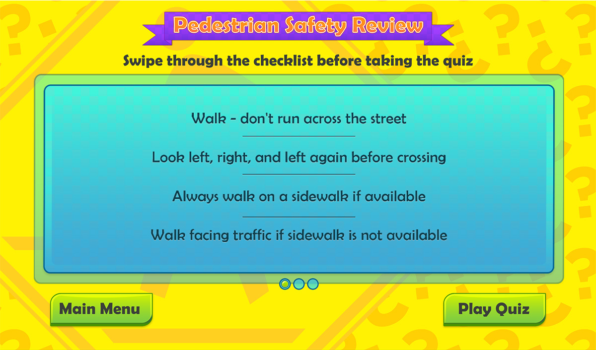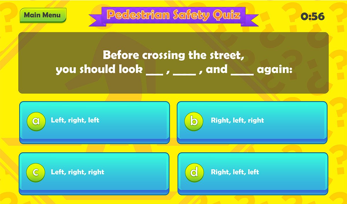 Traffic Safety Challenge is a tablet based mobile game that included aspects of both trivia and an arcade style racing game to help educate young children and teenagers the principles of pedestrian, bicycle, and traffic safety.